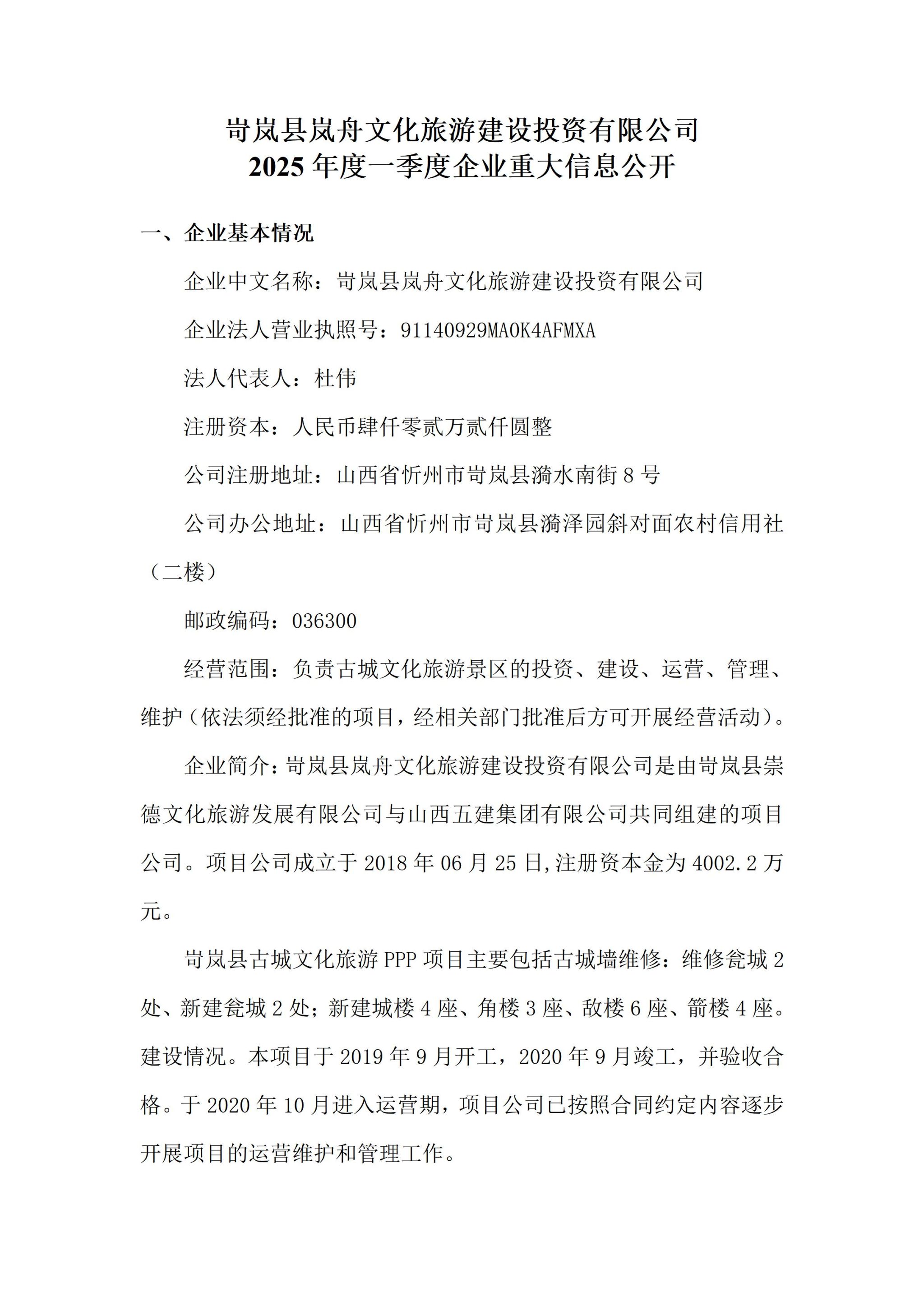 岢岚县岚舟文化旅游建设投资有限公司2025年第一季度企业重大信息果真