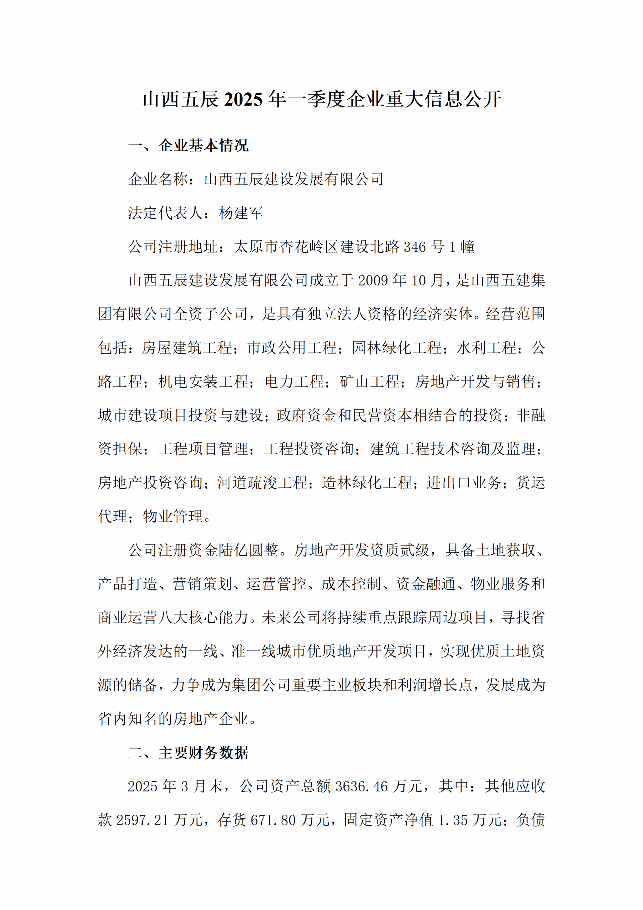 山西五辰建设生长有限公司2025年一季度企业重大信息果真