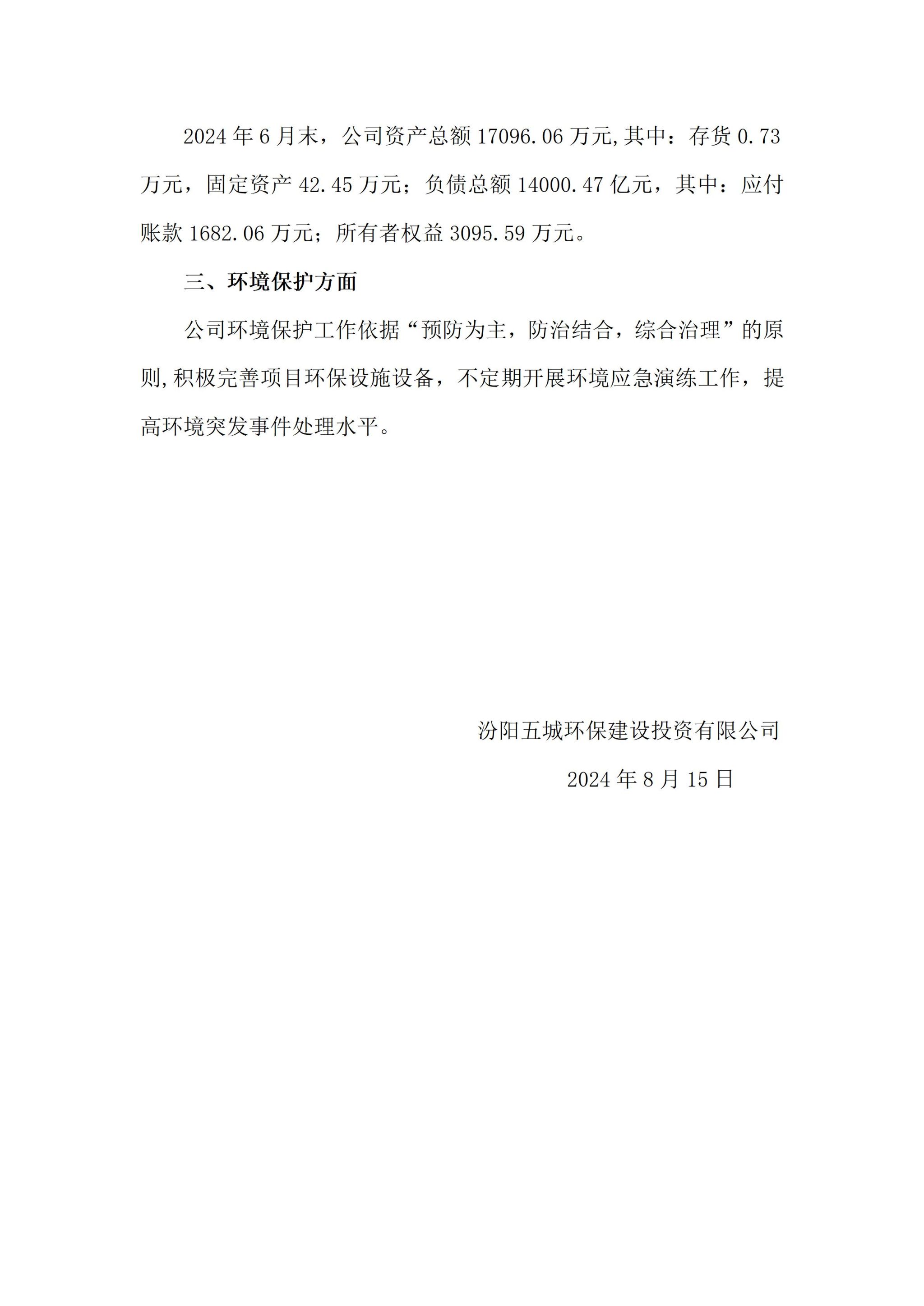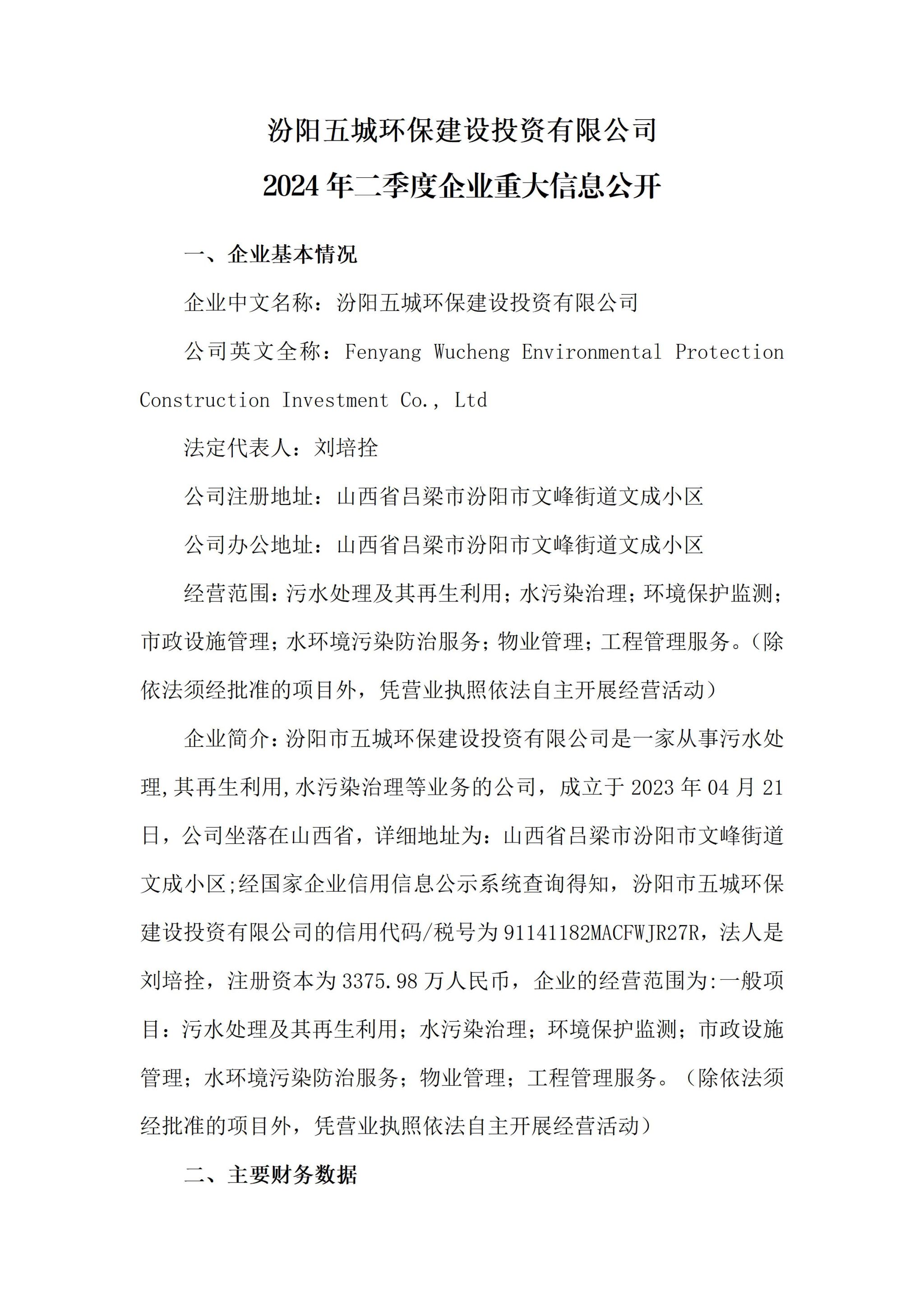 汾阳五城环保建设投资有限公司2024年二季度企业重大信息果真