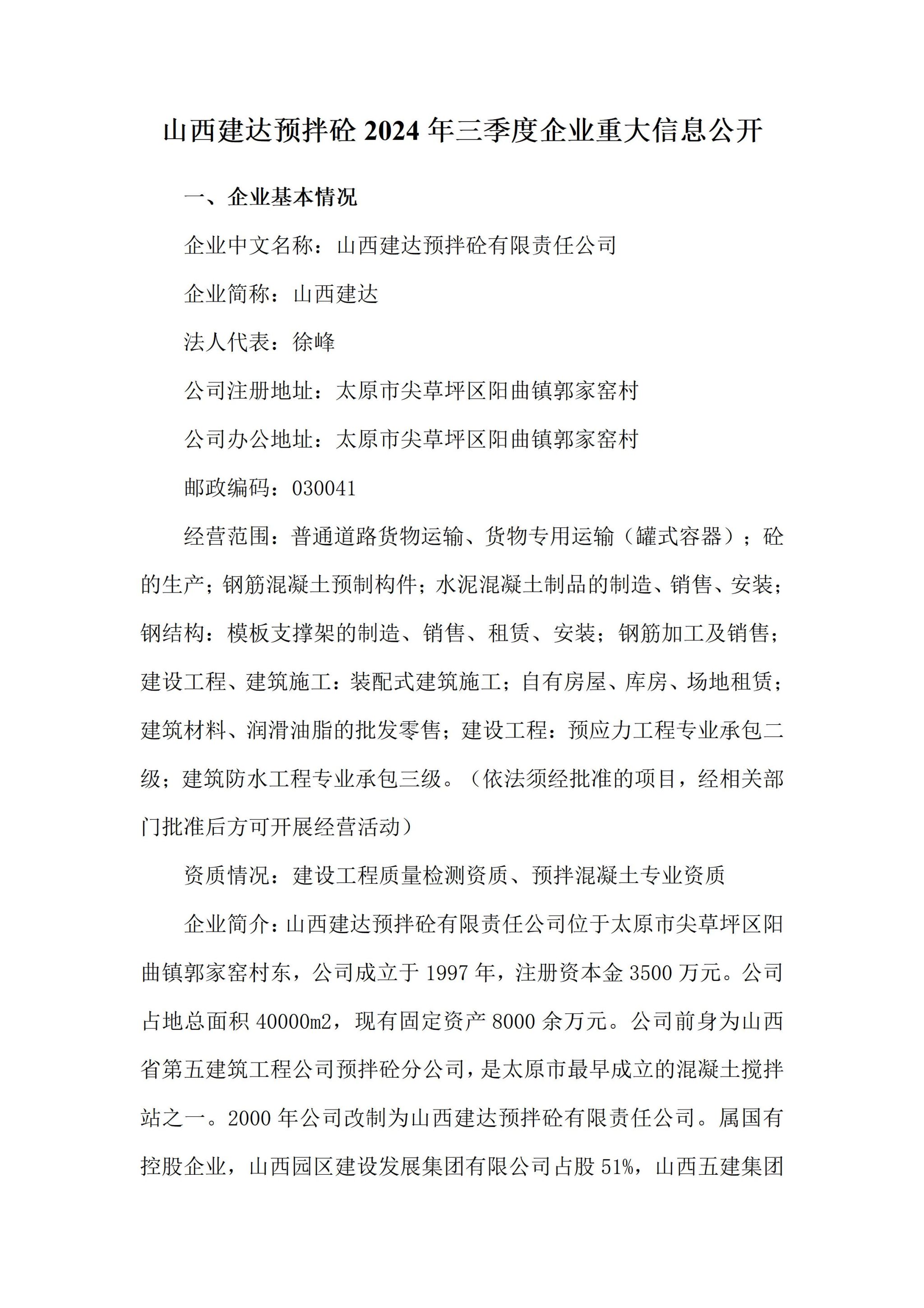 山西建达预拌砼有限责任公司2024年三季度企业重大信息果真