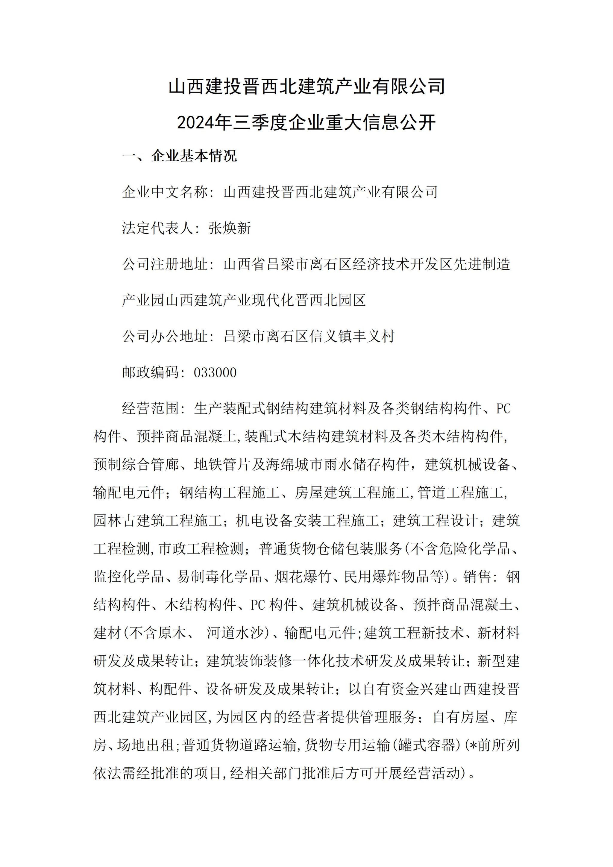 山西建投晋西北修建工业有限公司2024年三季度重大信息果真